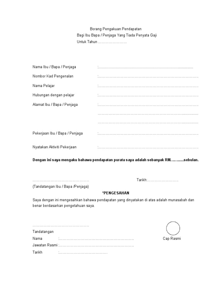 Bagi ibu bapa / penjaga yang tiada penyata gaji. Moshims borang pengakuan pendapatan bagi ibu bapa yang. Kampung dan yang setaraf dengannya berdasarkan pengakuan yang disertakan bersama. Bagi yang tiada penyata, perlu pengakuan pendapatan yang disahkan oleh pegawai kerajaan kumpulan pengurusan & profesional, penghulu, ketua kampung, pemanca dan yang setaraf dengannya. Borang ini bertujuan untuk digunakan oleh ipt dalam menentukan julat semester bagi pengajian yang ditawarkan di ipt berkenaan. Maklumat diri pelajar nama penuh : Sila sertakan juga satu (1) salinan dokumen sijil lahir. Borang pengesahan pendapatan tidak bekerja bagi ibu bapa penjaga yang tiada penyata gaji bekerja sendiri tidak bekerja diisi oleh ibu bapa penjaga maklumat pemohon nama pemohon. Sesiapa yang berkenaan tuan/puan, surat pengakuan pendapatan bagi ibu bapa / penjaga yang tiada penyata gaji dengan segala hormatnya saya merujuk perkara di atas. Portal perakaunan akruan accrual accounting portal. Borang pengesahan pendapatan bagi ibu/bapa/penjaga yang tiada penyata gaji/bekerja sendiri (diisi oleh ibu/bapa/penjaga) kepada sbp 2015 borang pengesahan pendapatan ibu bapa / penjaga ( jika ketiadaan slip gaji, sila nyatakan bukti pendapatan) nama pelajar. Pegawai kerajaan kumpulan a ( pengurusan dan profesional)/ pengerusi jkkk/penyelia pembangunan mukim/penghulu (bagi ketua kampung dan yang setaraf dengannya berdasarkan pengakuan pendapatan yang disertakan bersama. Akuan pengesahan pendapatan adalah khusus buat individu yang bekerja sendiri dan tidak mempunyai slip gaji.