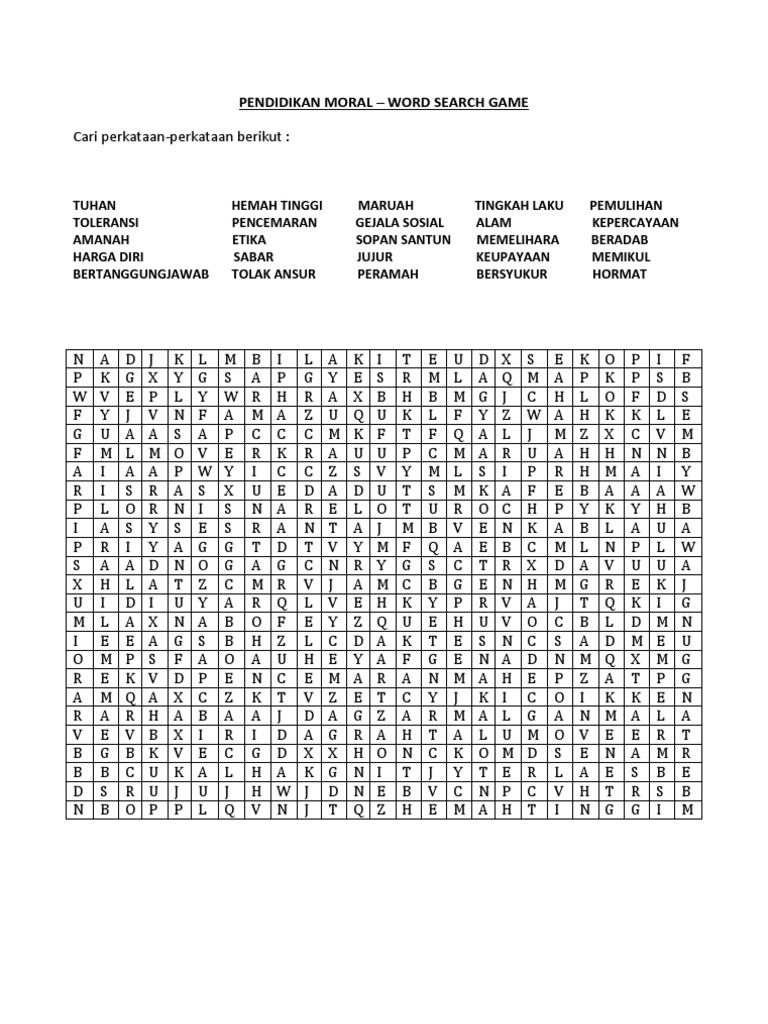 Hemah tinggi cari perkataan tersembunyi panitia bahasa malaysia. Cari perkataan tersembunyi apk is a puzzle games on android. Pendidikan moral setiap hari, setiap orang bertemu dengan situasi kehidupan yang membuatnya harus berpikir, membuat opini, mengambil keputusan dan melakukan tindakan. Ilmu dan pendidikan lintas bidang sebagai ilmu dan aplikasi pendidikan bag. Sesuai untuk murid prasekolah dan pendidikan pemulihanfull description. Bagaimana pendidikan moral harus diajar/pendekatannya? Sebelumnya, kita telah mengetahui contoh pidato singkat tentang pendidikan karakter, di mana contoh pidato dalam artikel tersebut berisi betapa pentingnya pendidikan karakter. Sekolah menengah yang didalam kurikulumnya terdapat pendidikan agama kristen, artinya baik segala bentuk proses belajar. Pendidikan moral itu sejatinya adalah proses pembelajaran yang dengannya peserta didik mampu memahami diri mereka sendiri, dan dunia yang ada di sekitarnya. Mencari perkataan tersembunyi / silangkata. We provide version 1.0, the latest version that has been optimized for different devices. Selengkapnya langsung saja simak uraiannya di bawah ini. Pendidikan moral word search game cari perkataan perkataan berikut :